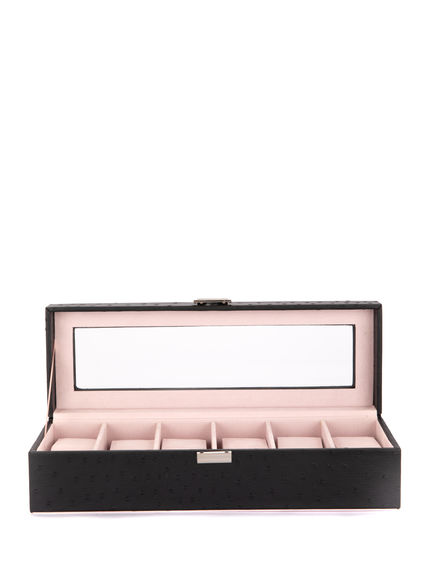 A simple yet sleek way to keep your watches safe and sound. Whether it be to store or display six of your favorite watches, this black watch compartment made with fine leatherette will keep your prized possessions organized in style.