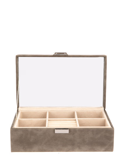 A classy container designed to keep your most treasured pieces safe and sound. Made with a fine brown leatherette, this medium sized jewelry box is complete with multiple compartments best suited for various types of jewelry.