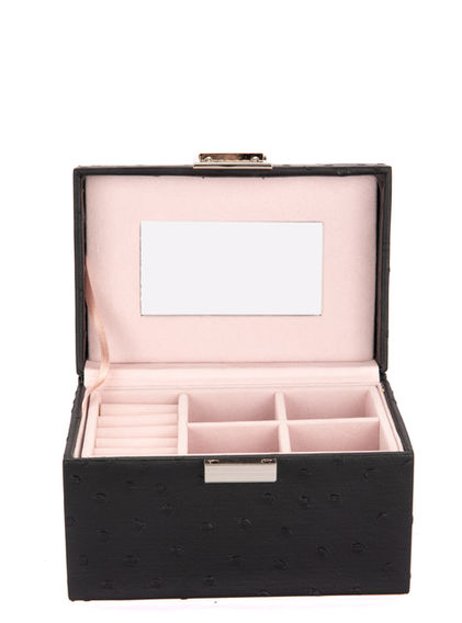 A chic compact compartment designed to store only your most treasured pieces. This small yet stylish jewelry box is made with bold black leatherette with a unique texture, perfect for you to spice up your collection and safely store your jewelry